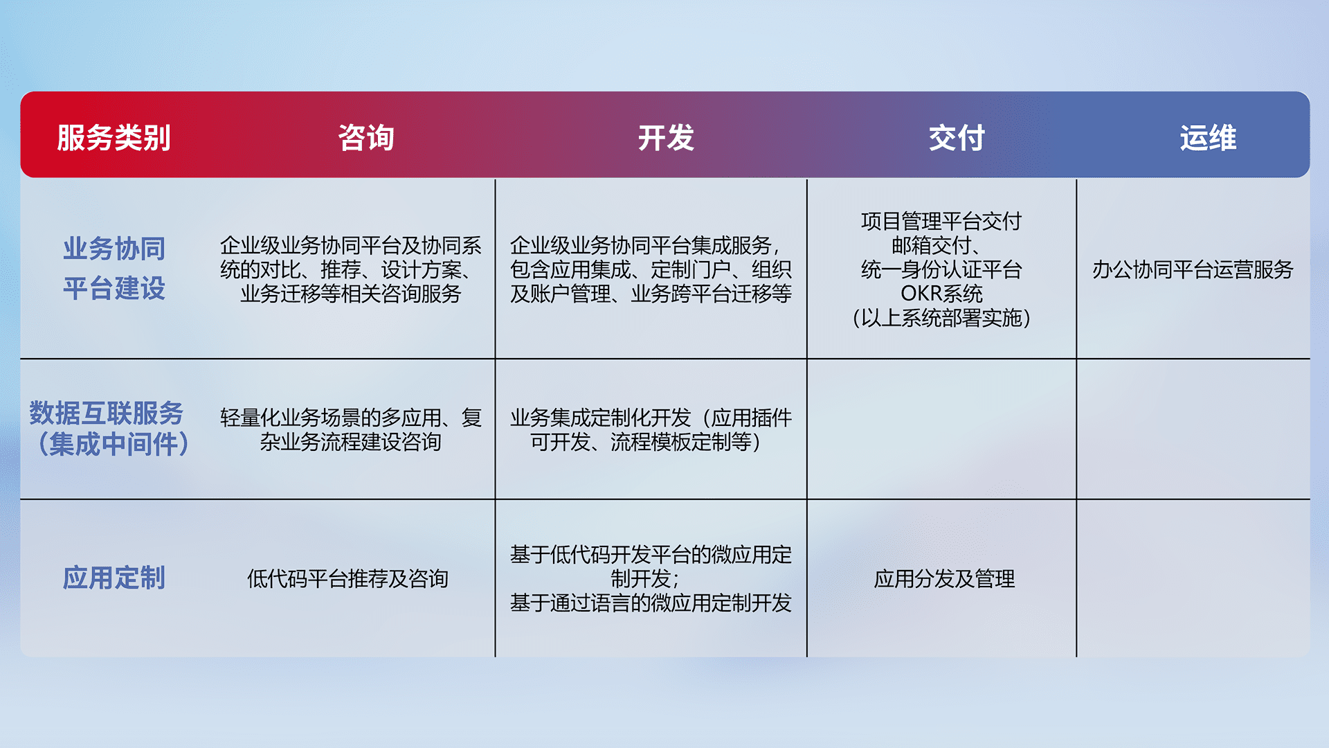 针对钉钉、、企微、、、、IDaas等平台级产品提供产品的规划、、、方案、、、、交付、、定制化开发等服务,,,,实现如统一协同办公、、智能客户服务、、、、混合会议管理、、智能数据查询、、等业务场景,,,,实现数字化转型。。。。